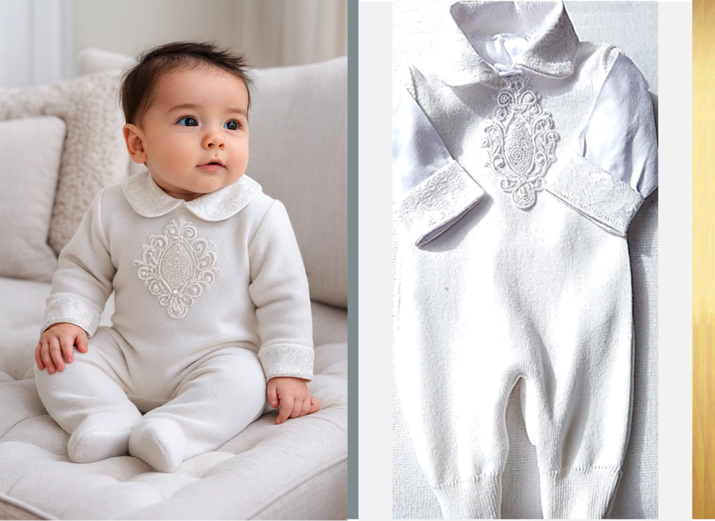 Macacão Arte Mary Baby com gola adamascada produzido em tricô com material hipoalergênico de alta qualidade especial para bebês e crianças, composto por 50% algodão e 50% acrílico, proporciona conforto e mobilidade e desing diferenciado.