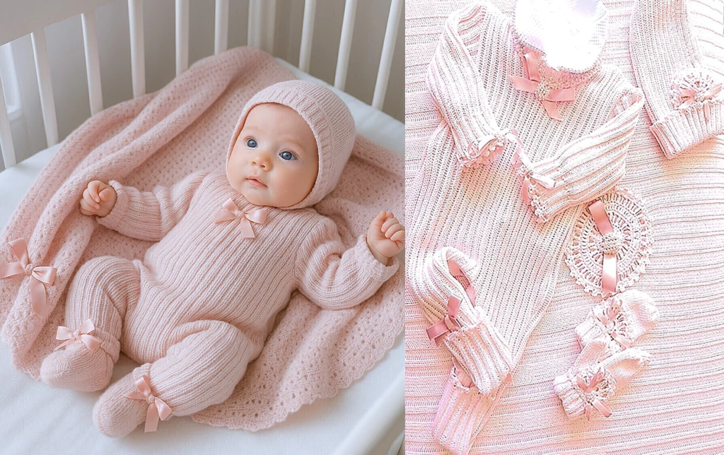 Saída Maternidade Arte Mary Baby produzida em tricô com material hipoalergênico de alta qualidade especial para bebês e crianças, composto por 50% algodão e 50% acrílico, proporciona conforto e mobilidade e desing diferenciado.